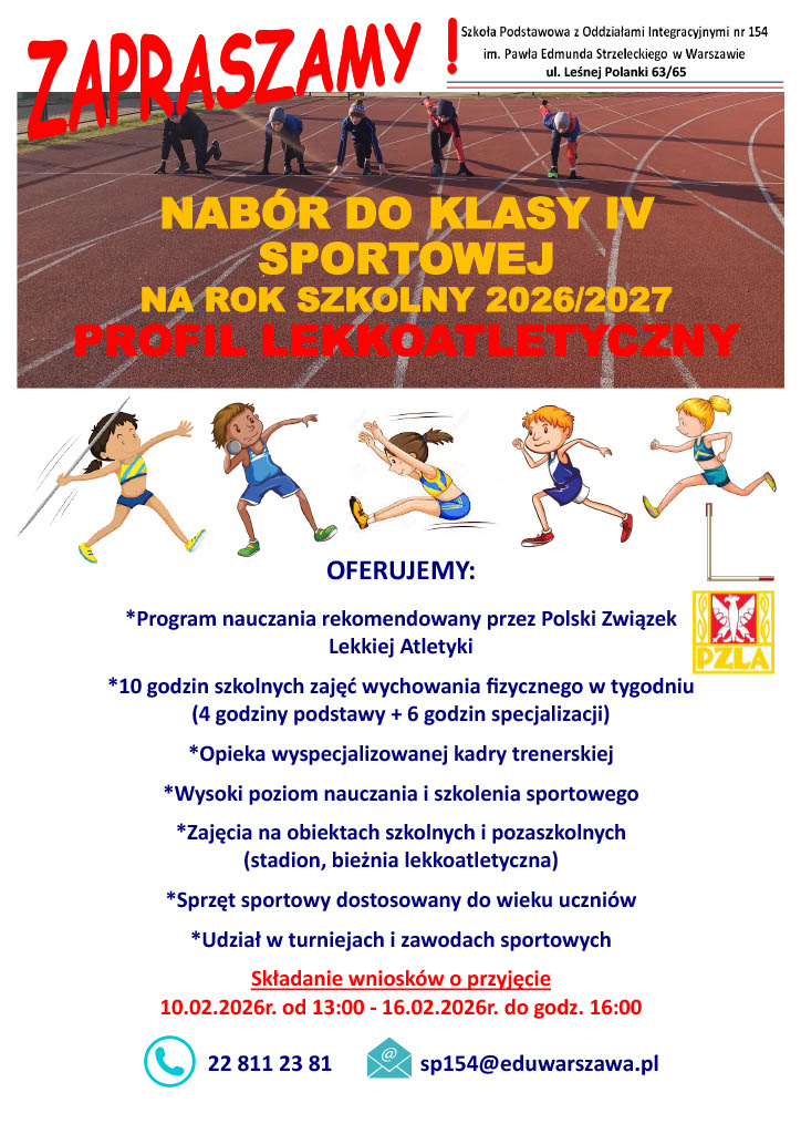 Próba sprawnościowa do klasy IV sportowej o profilu lekkoatletycznym odbędzie się 21.02.2026 r. na sali gimnastycznej w budynku szkoły przy ul. Leśnej Polanki 63/65 o godzinie 10:00.